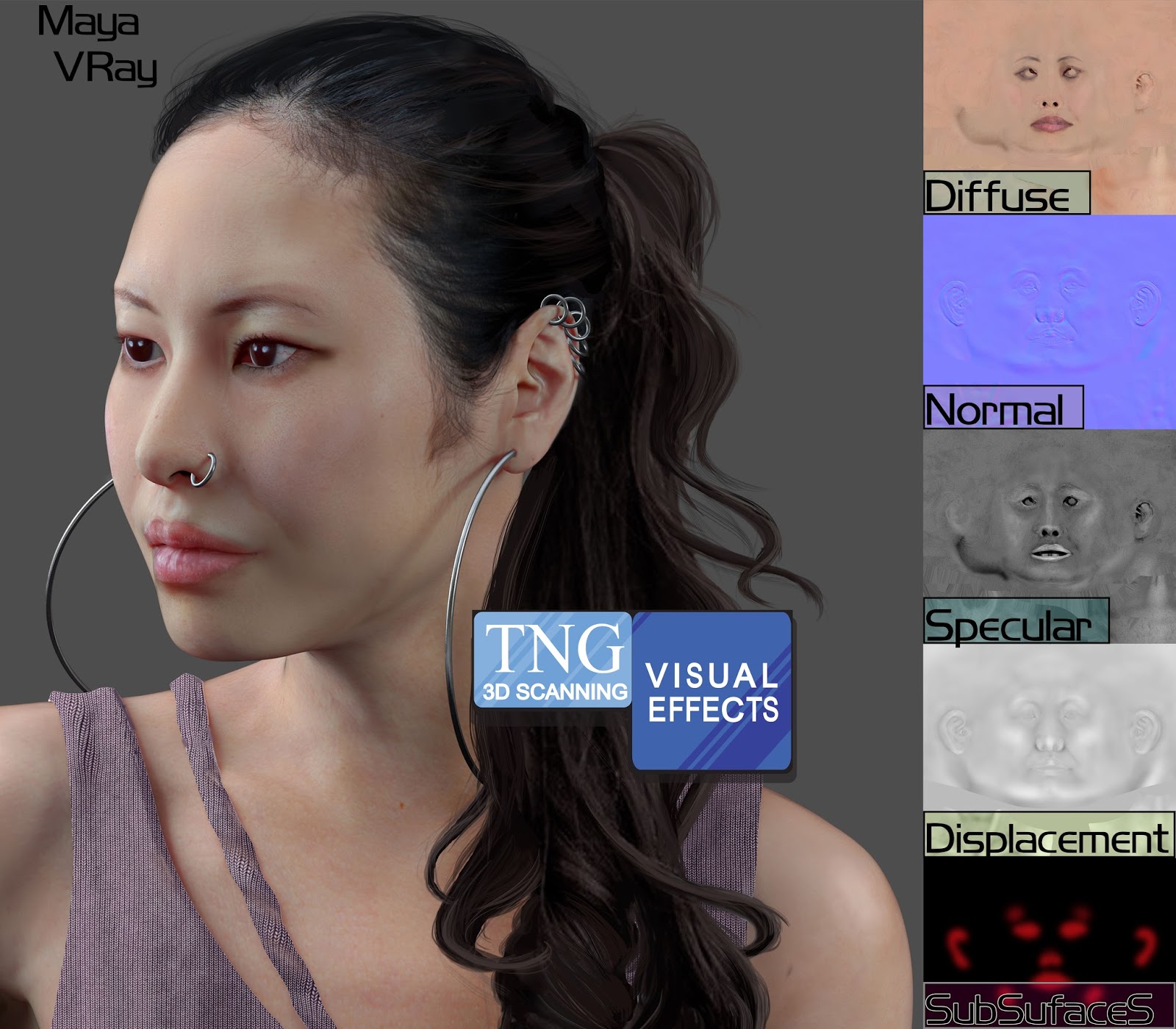 Here is our lasted render, Natsuko. She was rendered in Maya via VRay. We used subsurface scattering to make the skin look realistic, and also laid out the various texture maps for you to view. This is a sample of our work. Let us know if you have any questions about our services.